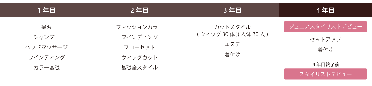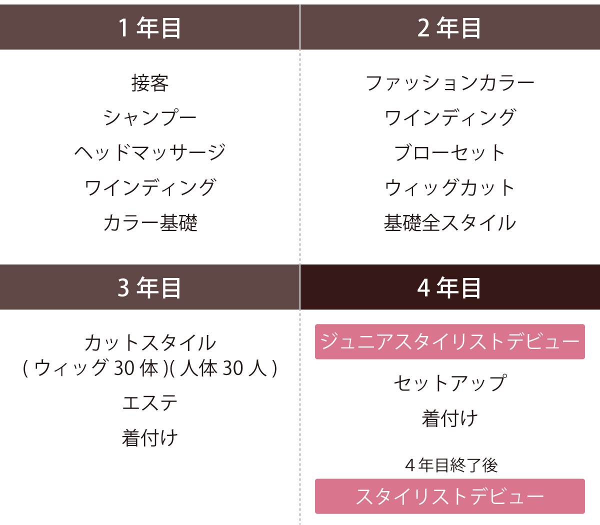 教育カリキュラムは、レッスンで学んだことを実際のサロンワークの中で取り入れて実践しながら身につけていきます。